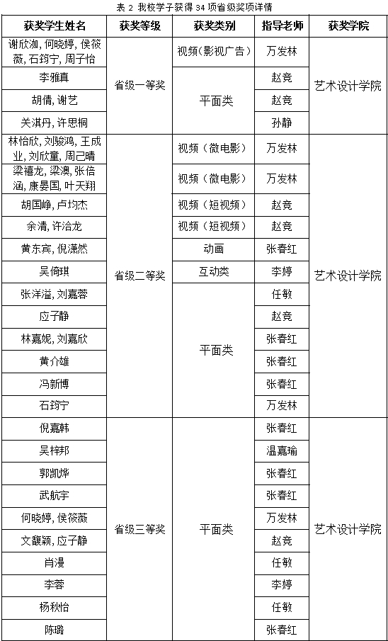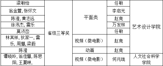 具体奖项包括:国家级一、二、三等奖各1项,优秀奖3项;省级一等奖4项,二等奖12项,三等奖18项;赵竞、万发林、孙静3名指导教师获“优秀指导教师”称号;艺术设计学院获“广东赛区优秀组织奖”。