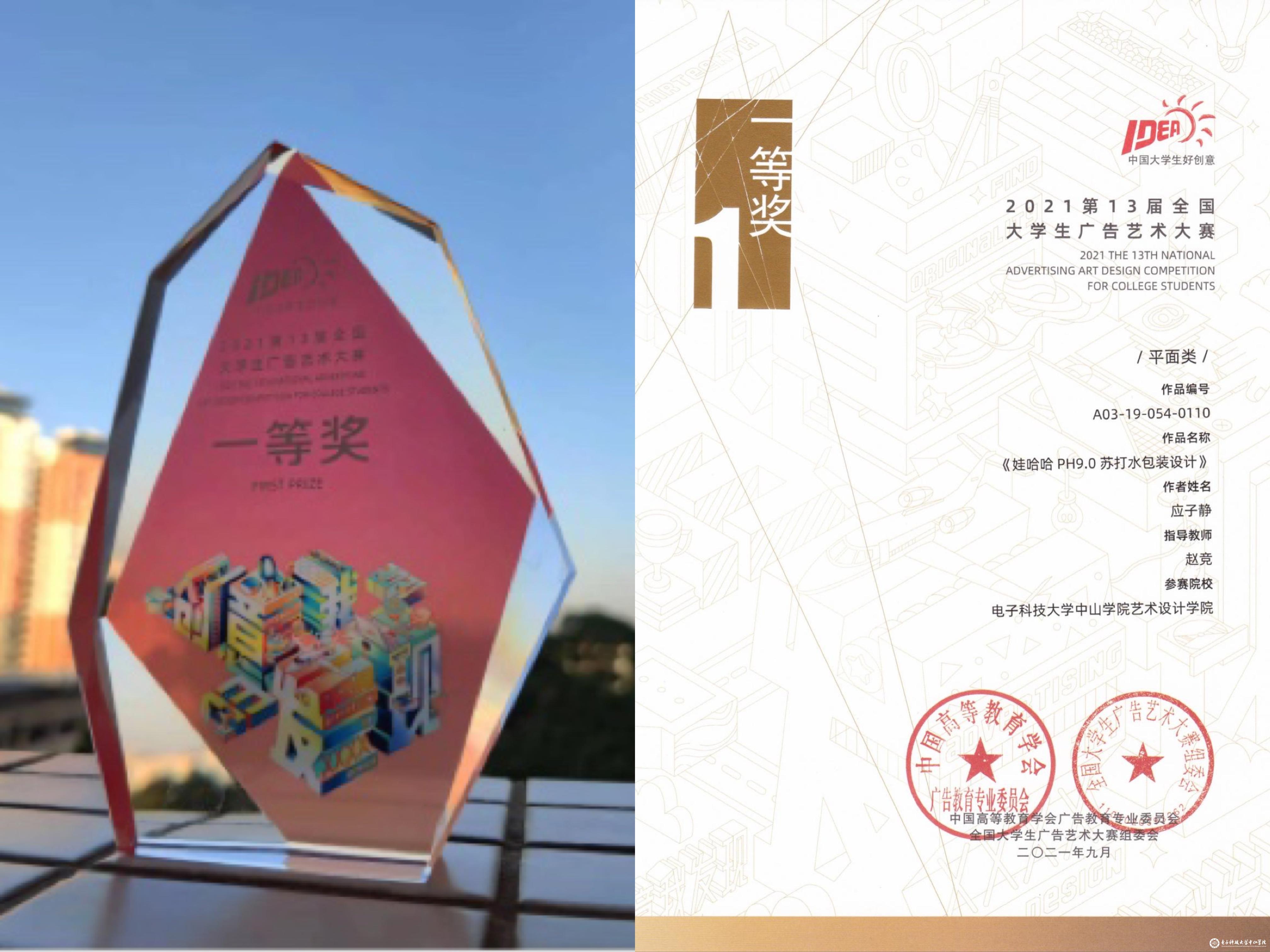 视觉传达18应子静同学获得国家级一等奖的奖杯和证书