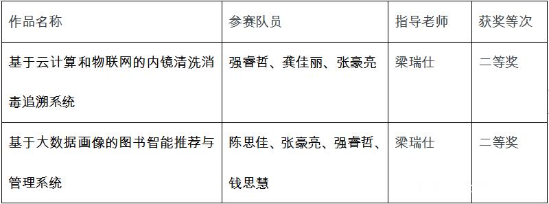 经过校内选送、线下初审和决赛答辩,我校强睿哲等同学的作品《基于云计算和物联网的内镜清洗消毒追溯系统》和陈思佳等同学的作品《基于大数据画像的图书智能推荐与管理系统》获专家评委高度评价,均获得本次大赛二等奖。